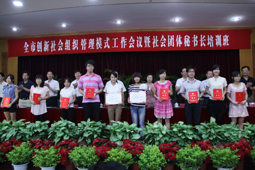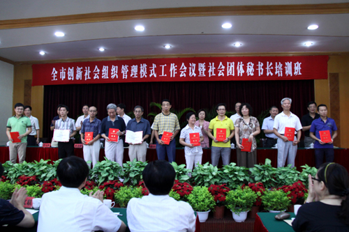 2011年8月24日,为贯彻落实中央和省委、市委关于加强社会建设的决定的工作部署和要求,我市组织召开了“全市创新社会组织管理模式工作会议暨社会团体秘书长培训班”。汕头市政府、省民间组织管理局、汕头市民政局、市发改局、市财政局、市编办有关领导出席会议,并为一批受到中共广东省社会组织工作委员会表彰的先进党团组织、党团员颁发了奖牌、证书。汕头市社会组织业务主管(指导)单位分管领导、市级社会团体秘书长和各区县民政局社会组织登记管理工作的分管领导、负责人共计300多人参加了会议。此次会议分上下两个半场,上半场会议由汕头市政府副秘书长马逸丽同志主持,汕头市民政局党组书记、局长王良源同志作了全市社会组织工作报告,汕头市政府副市长周镇松同志作了动员讲话;下半场会议,组织了社会团体秘书长系统培训,省、市社会组织工作有关领导、专家进行了授课。