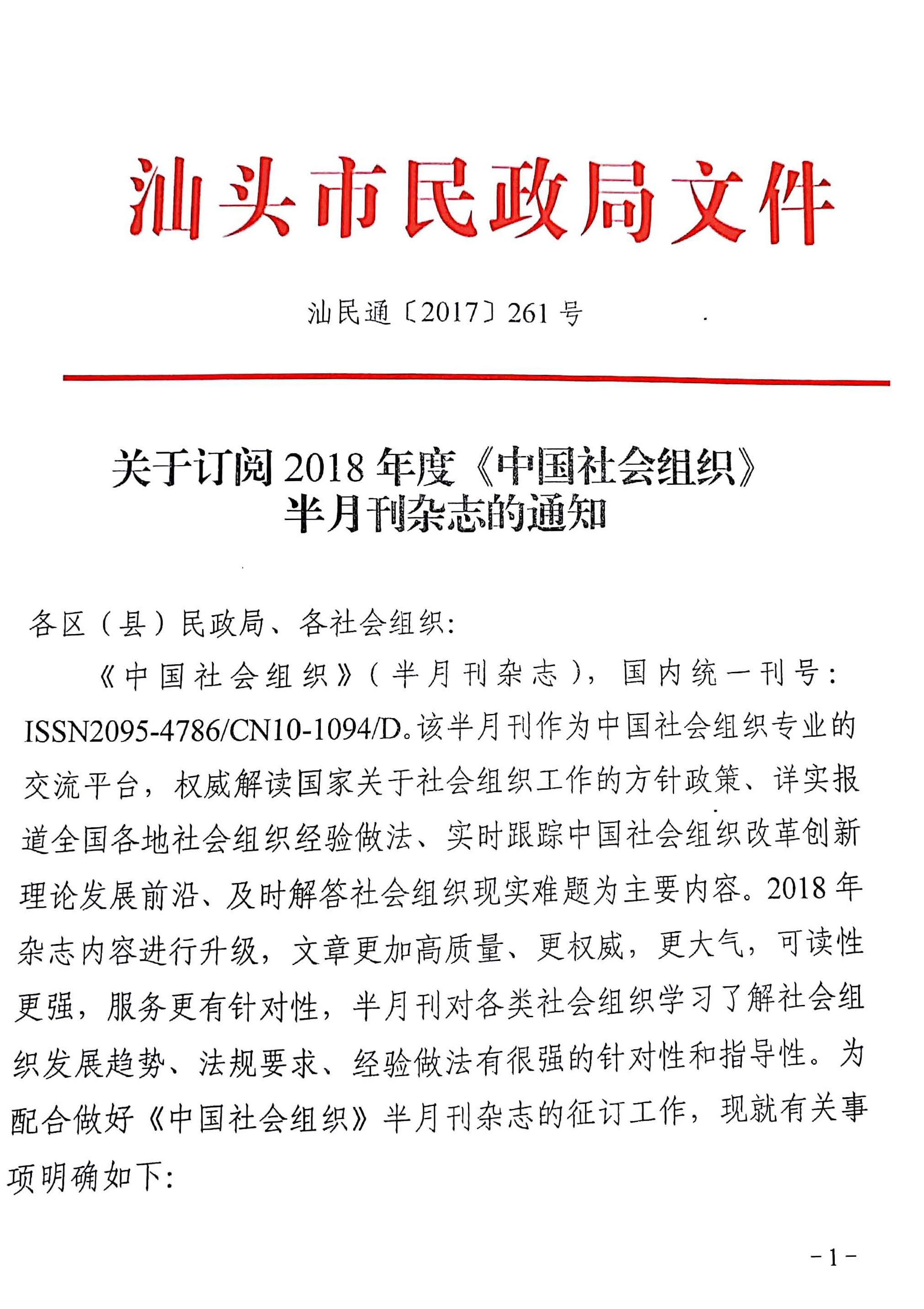 关于订阅2018年《中国社会组织》半月刊杂志的通知
