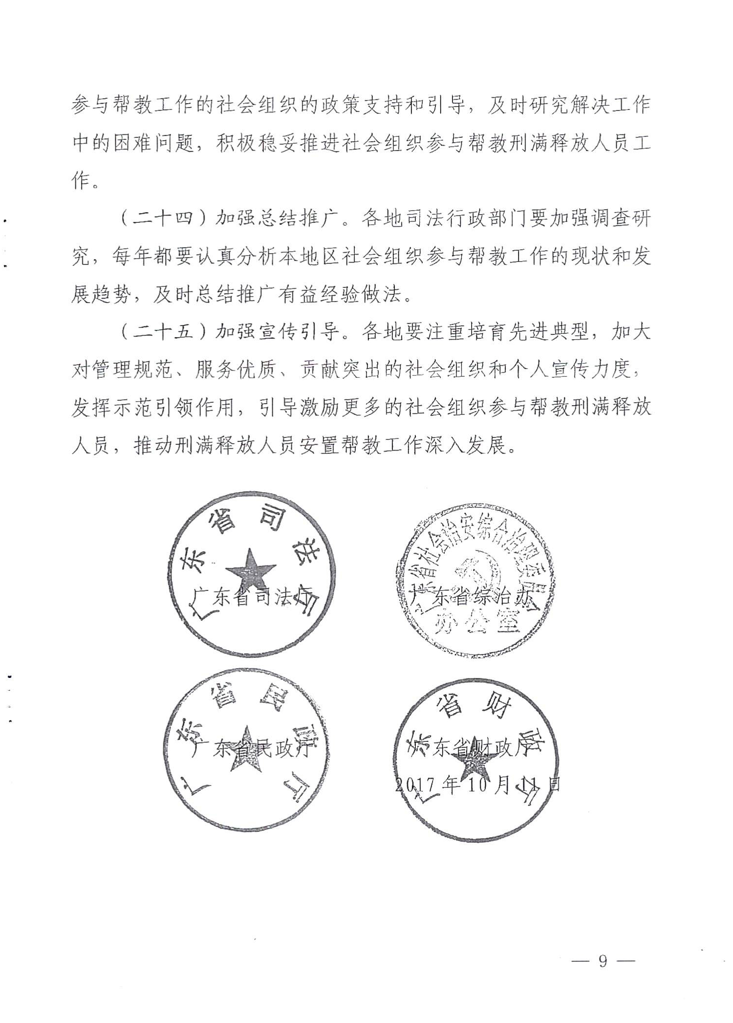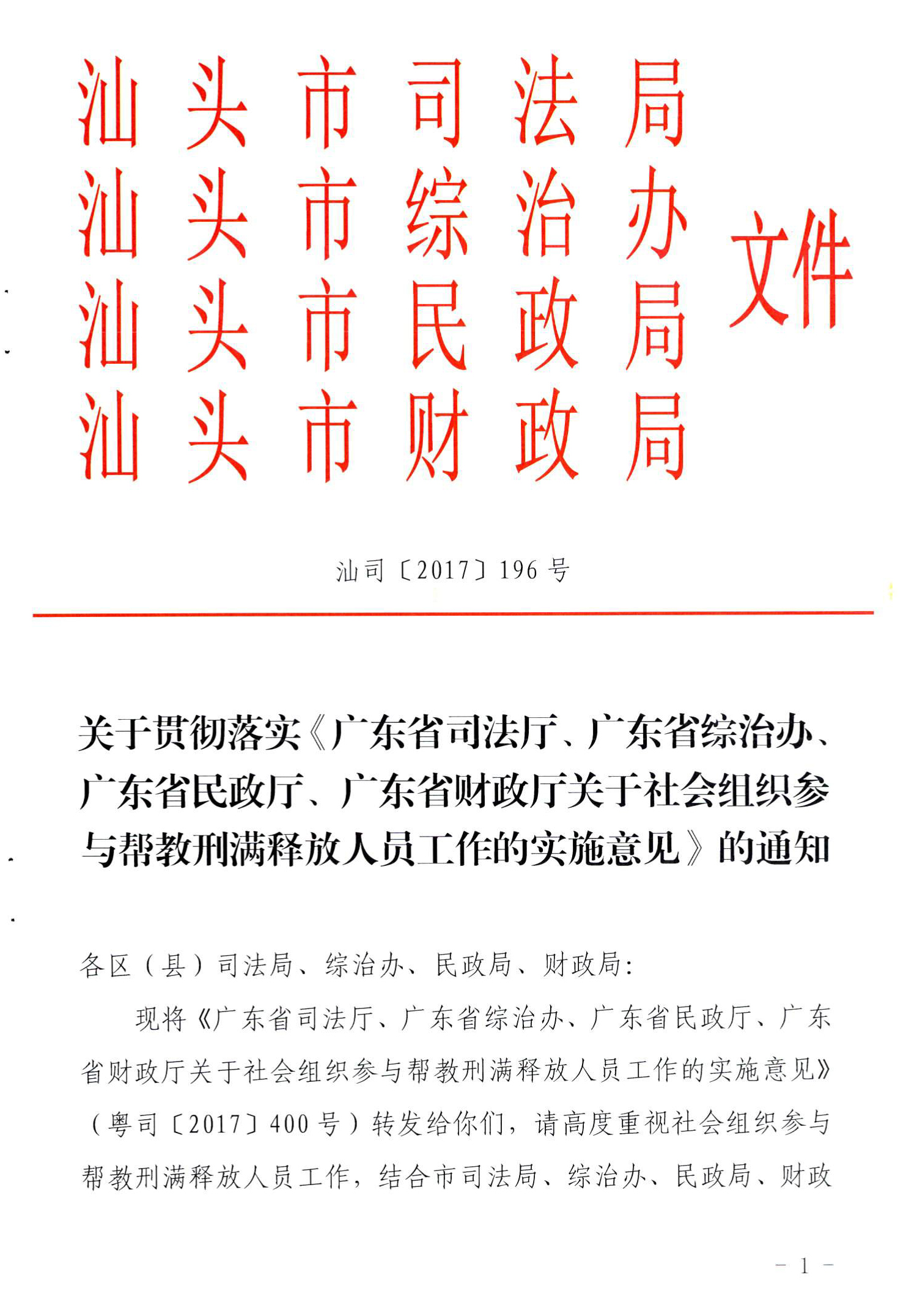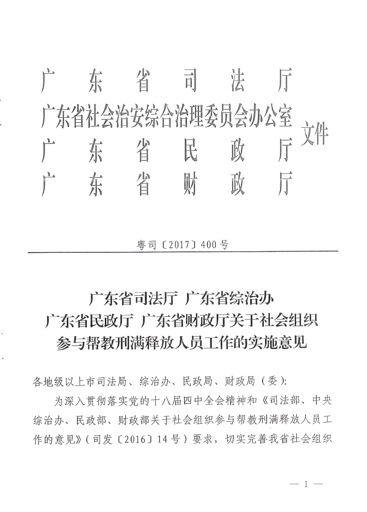 关于贯彻落实《广东省司法厅、广东省综治办、广东省民政厅、广东省财政厅关于社会组织参与帮教刑满释放人员工作的实施意见》的通知