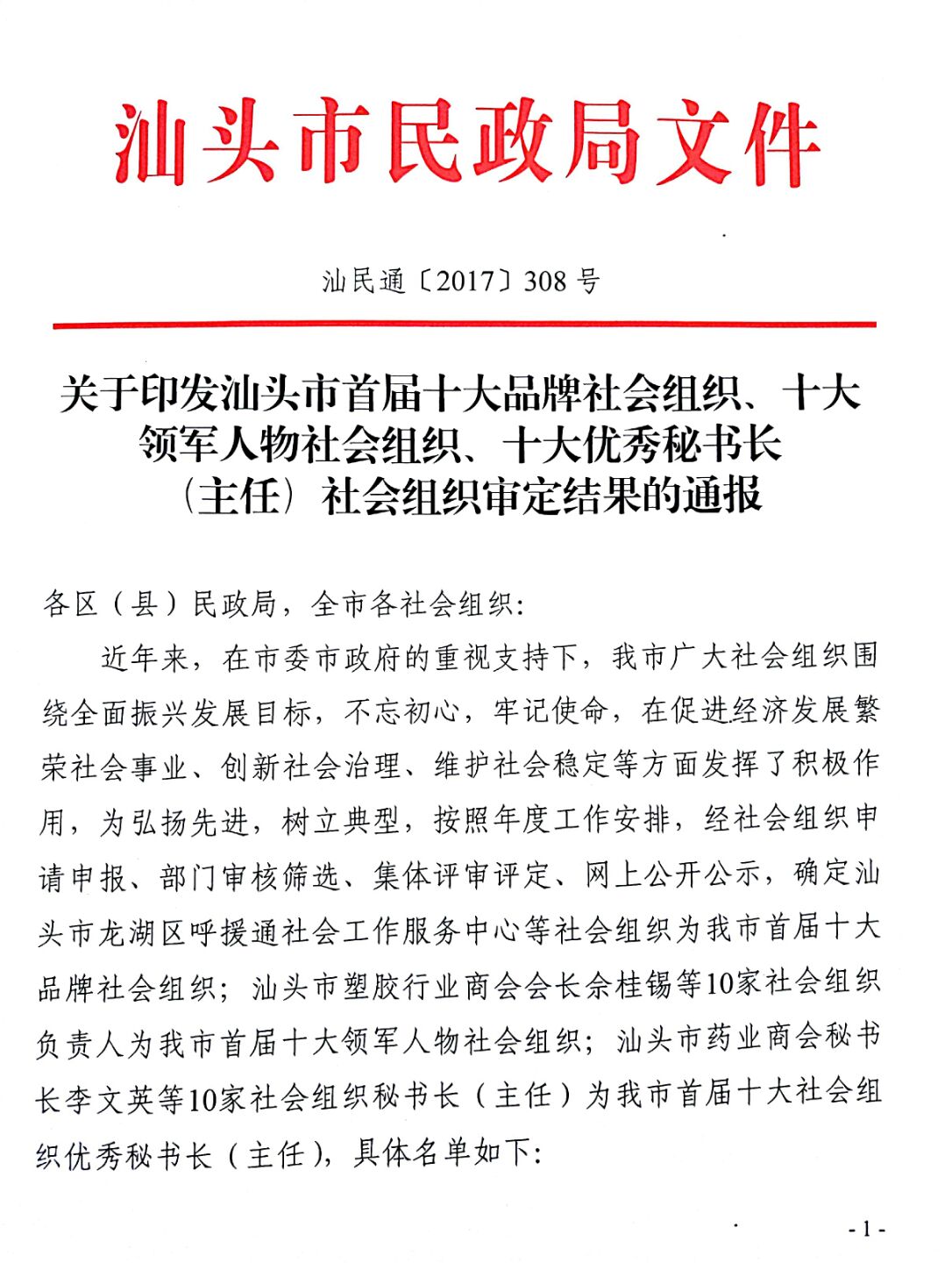 关于印发汕头市首届十大品牌社会组织、十大领军人物社会组织、十大优秀秘书长(主任)社会组织审定结果的通报