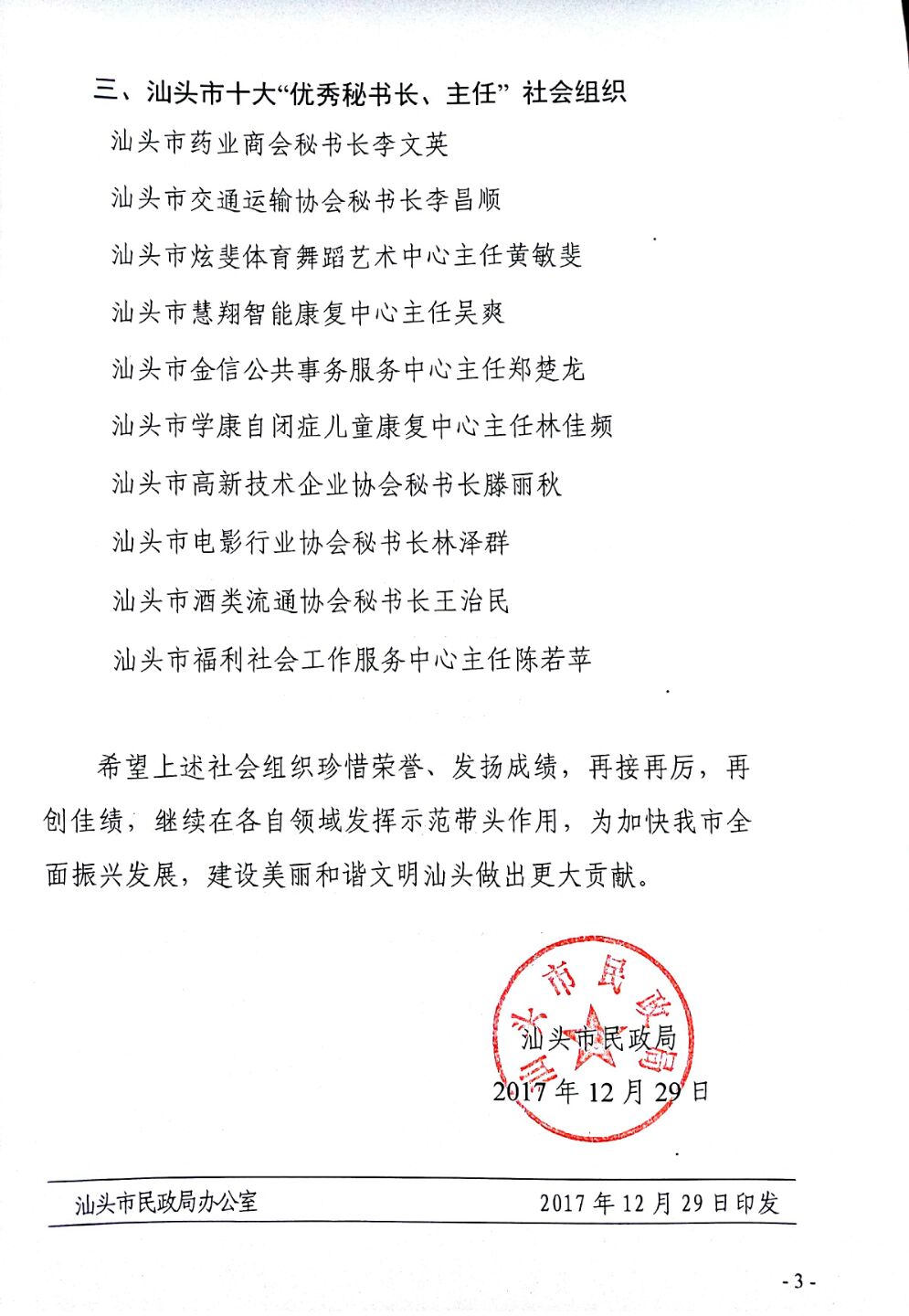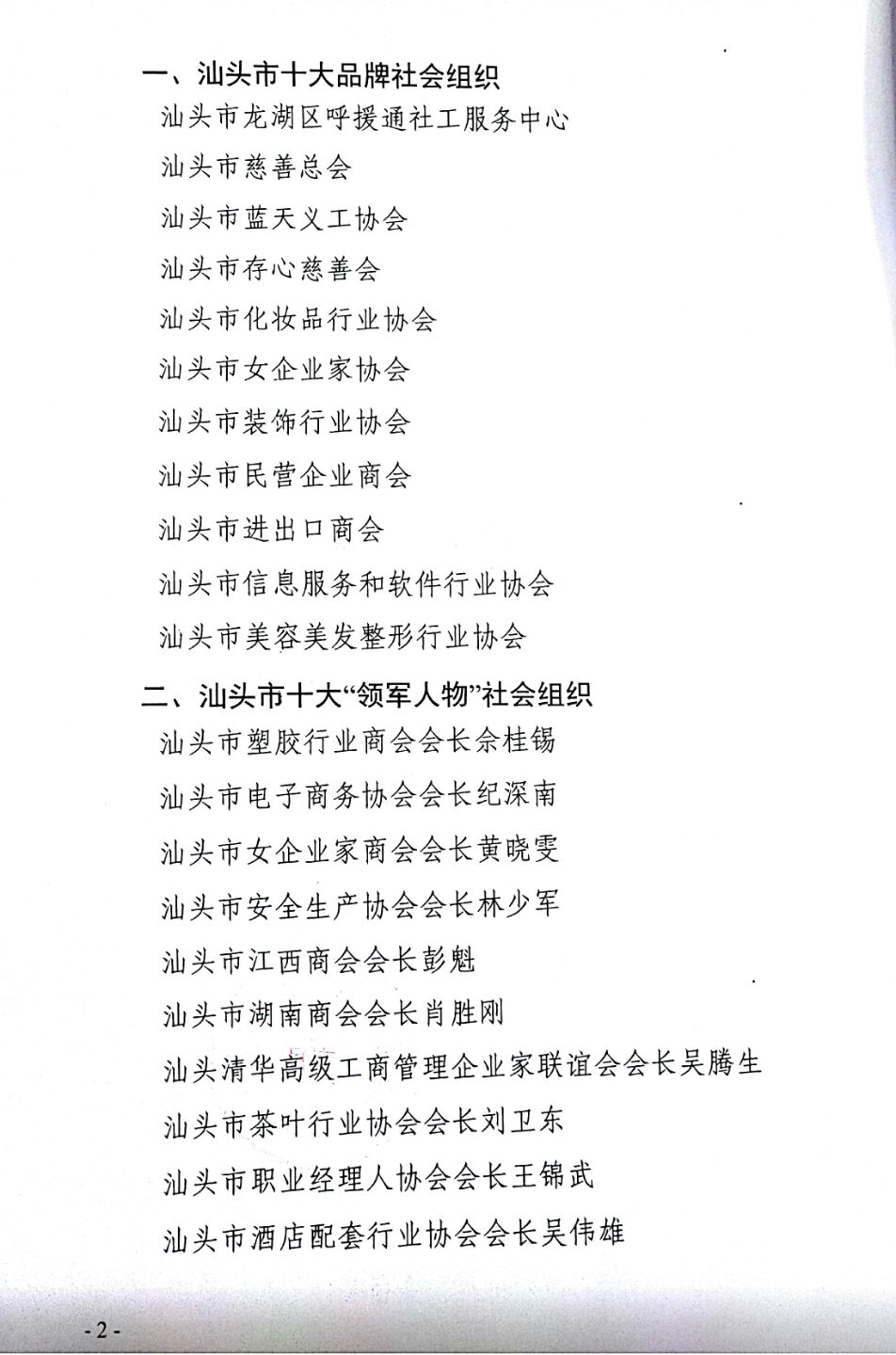 汕头市民政局关于首届十大品牌社会组织、十大领军人物、十大优秀秘书长(主任)名单公示