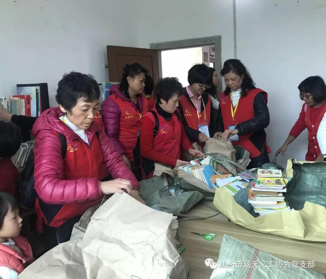 2018年1月1日,汕头市蓝天义工协会党支部组织党员志愿者们将筹集到的4000册图书、书桌书柜等一批物资送到与汕头市环境保护局、华能汕头电厂共同帮扶援建的潮阳区铜盂镇溪东村乡村图书室,并举行了图书室揭牌仪式,为村民、学生打开知识、见识的窗口,点燃知识的明灯。