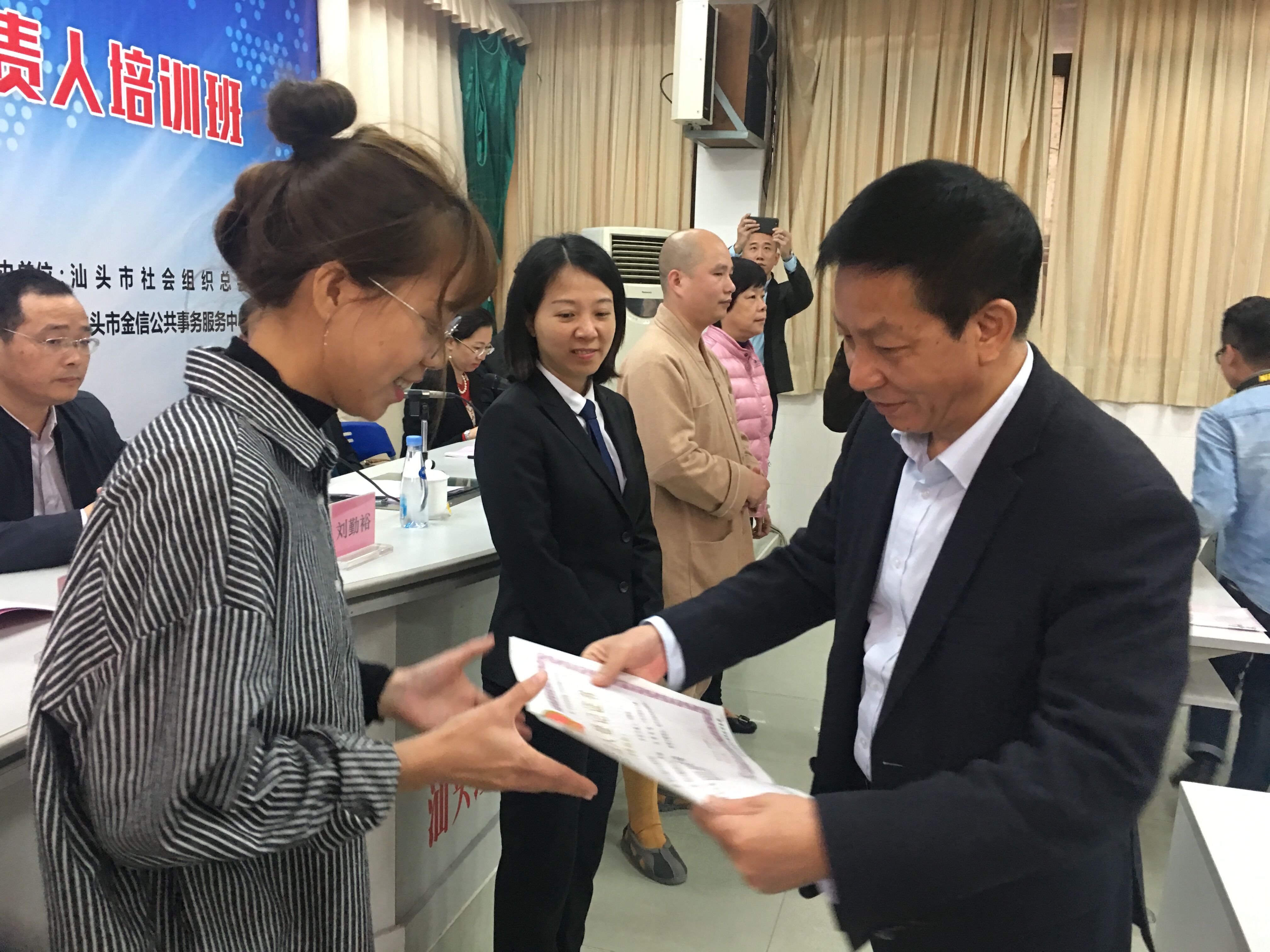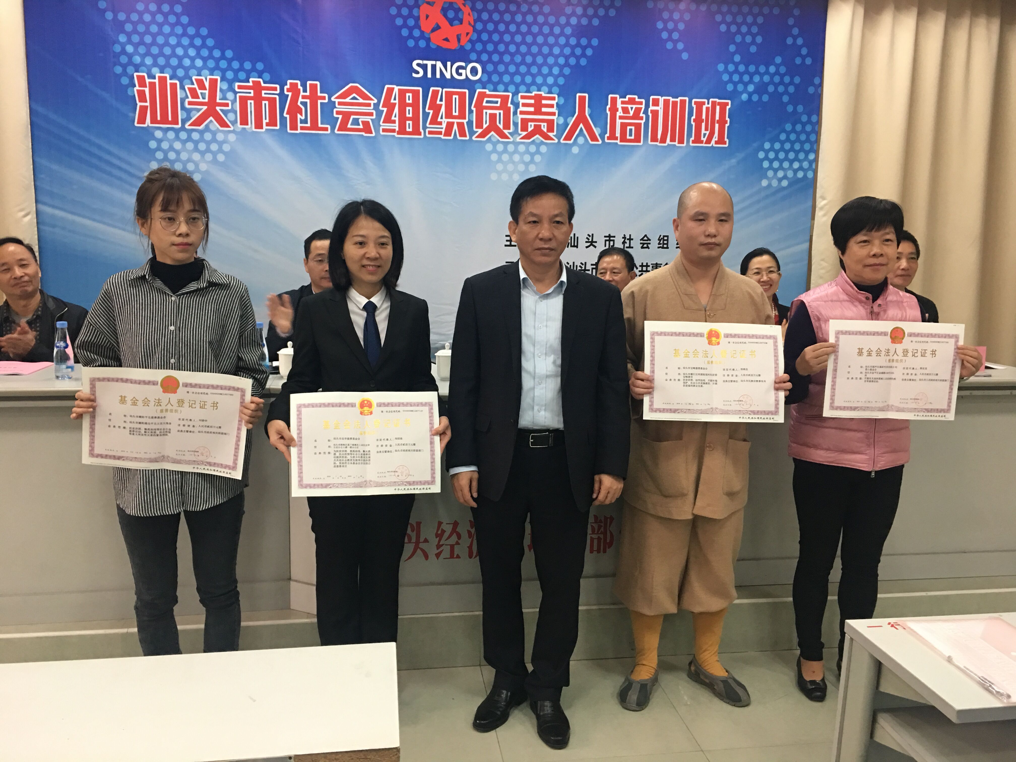 在培训班开班仪式上,汕头市民政局向汕头市朝阳平北慈善基金会、市宜华慈善基金会、市宝峰慈善基金会、市超声仪器有限公司慈善基金会代表颁发了慈善组织认定证书。