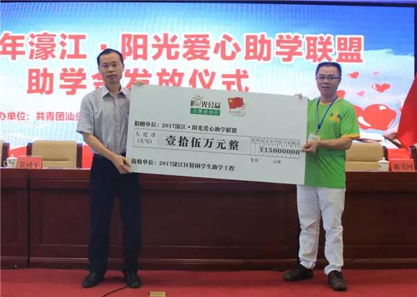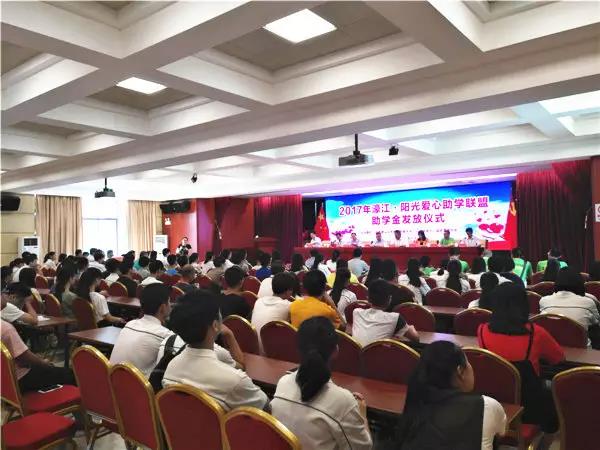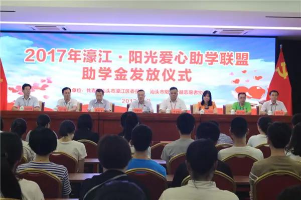 8月29日下午,团濠江区委联合汕头市阳光公益志愿者协会举行2017濠江·阳光爱心助学联盟助学金发放仪式。区委常委方楷鸿、区人大常委会副主任李业顺、区政府副区长黄树平、区政协副主席马烈坤、区纪委副书记方壮雄、市阳光公益志愿者协会会长陈美河,以及区教育局有关领导和嘉宾出席仪式。各单位、爱心助学联盟商家和热心人士代表,及本年度受资助学生代表共一百多人参加了活动。活动由团区委书记(挂区党政办副主任)蔡伟强主持。