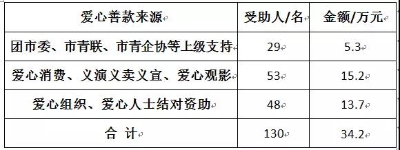 其中,争取团市委、市青联和市青企协等上级支持5.3万元;举办爱心消费、义演义卖、爱心观影等系列活动募集善款15.2万元;通过牵线搭桥,成功促成爱心组织和爱心人士以“一对一”或“一对多”的方式结对资助48名贫困学子,涉及助学金13.7万元,均由资助人直接汇款给学子。