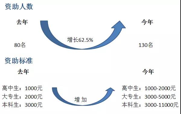 一是助学对象更加精准,助学规模显著扩大。8月上旬组织志愿者深入各个街道相关社区,入户走访审核贫困学子家庭情况,确保实现精准帮扶、精准助学。在此基础上,大幅增加了资助人数,并将部分去年受资助的特困在读生也列入资助范围。今年共资助学子130名,比去年增加了62.5%。同时,还提高了资助标准,并对建档立户、低保户、特困户学子额外增加资助金额,以实际行动参与到精准扶贫工作当中。