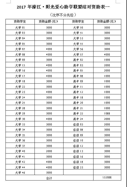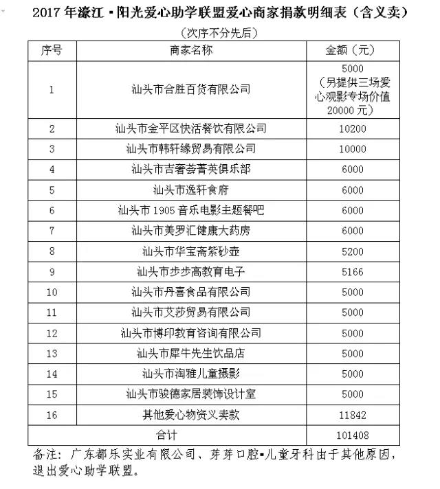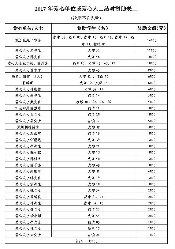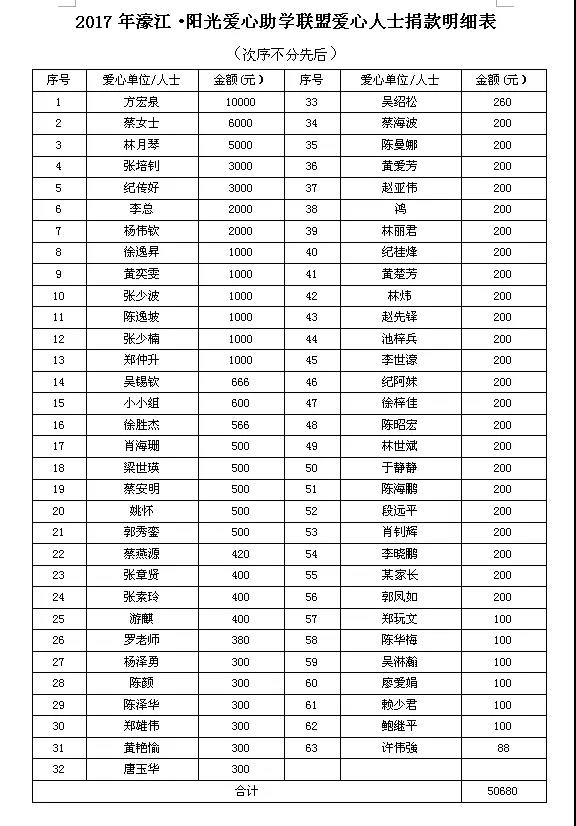 三是宣传方式更加多样,参与程度显著增强。通过“今日濠江”“濠江青年”“阳光公益”等微信公众号,以及今日视线、汕头日报、特区晚报、橄榄台等媒体对活动进行专题宣传报道,大大提高助学活动的社会参与面和影响力。还向全社会发出助学倡议,发动爱心组织和爱心人士“一对一”或“一对多”结对资助贫困学子。此外,还按照“同高校学习、同街道居住、同城市生活”的结对原则,探索建立“展翅计划”实习生与贫困大学新生“1+1”结对帮扶模式,在物质支持的基础上,为贫困新生提供精神激励、心理引导、学业帮扶等服务,帮助他们更快更好地融入大学生活。 2017濠江·阳光爱心助学联盟活动 捐款及资助明细表附后