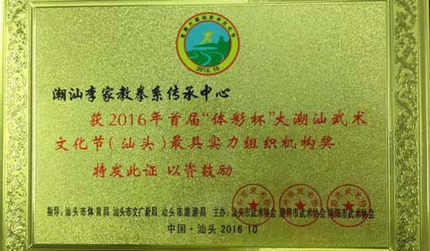汕头市潮汕李家教拳系传承中心获2016年首届“体彩杯”大潮汕武术文化节(汕头)最具实力组织机构奖。