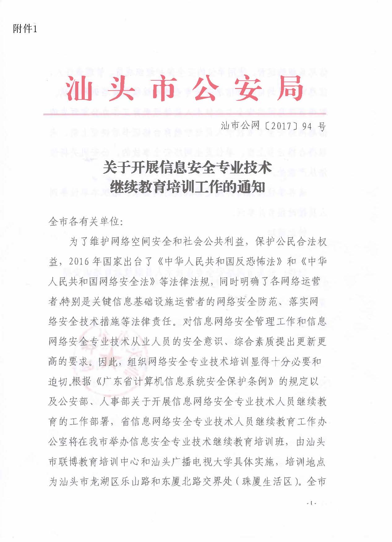 1、关于开展信息安全专业技术继续教育培训工作的通知