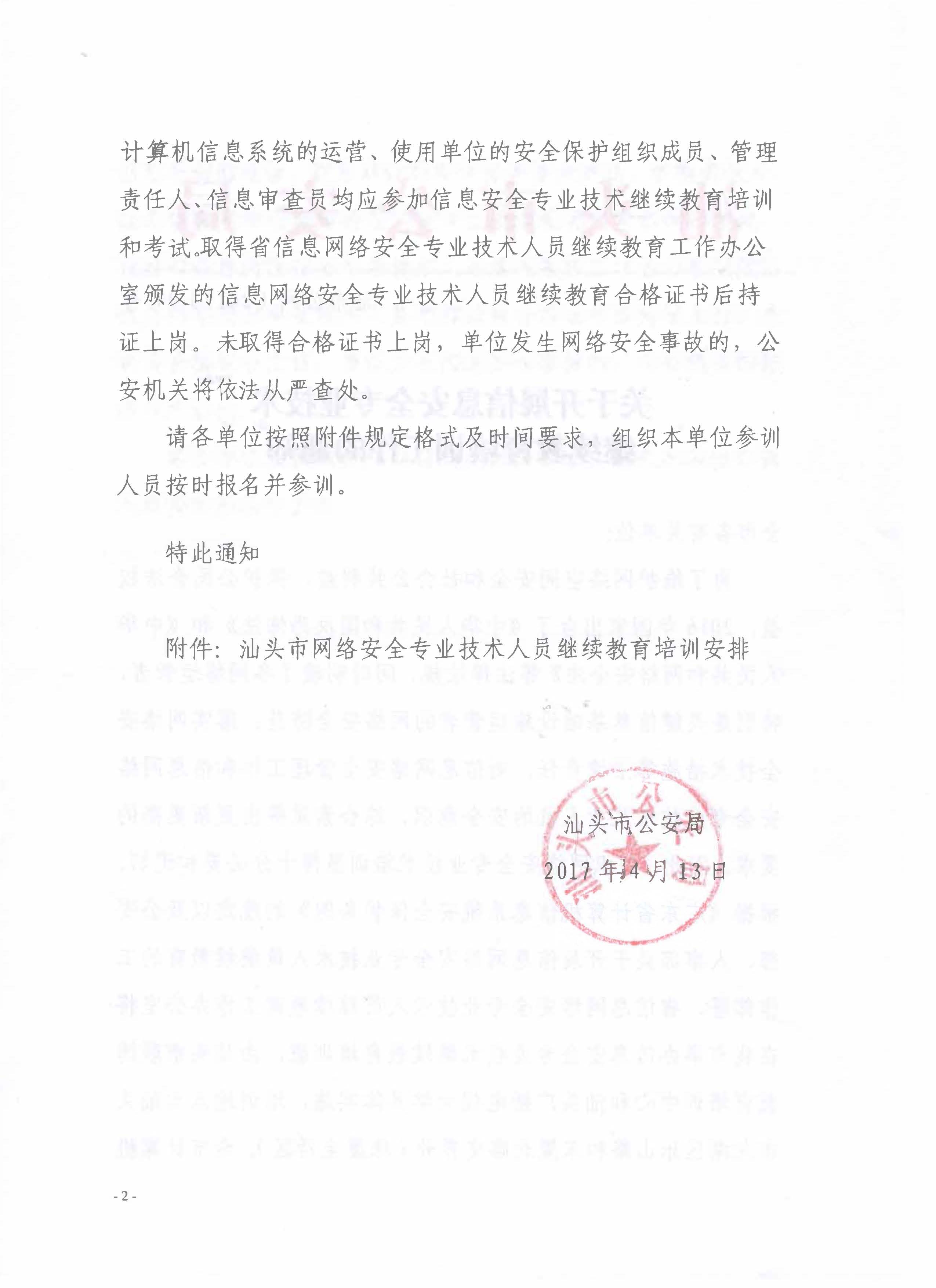 为贯彻落实《中华人民共和国网络安全法》和汕头公安局《关于开展信息安全专业技术人员继续教育培训工作的通知》(汕市公网【2017】94号)精神,为维护网络安全,提高网络专业技术人员综合素质,市社会组织总会将组织全市各社会组织负责人和管理人员参加由市联博培训中心承办、省公安厅在我市举办的《信息网络安全专业技术继续教育》培训班培训,参加培训人员考试合格后,将取得由广东省公安厅信息网络安全工作办公室统一颁发的继续教育合格证。今后有关部门对网络管理将按持证上岗要求进行管理,请各社会组织按照《汕头市网络安全专业技术人员继续教育培训安排》,依照自愿原则,按时报名并参训。有关收费及其他事项见附件。